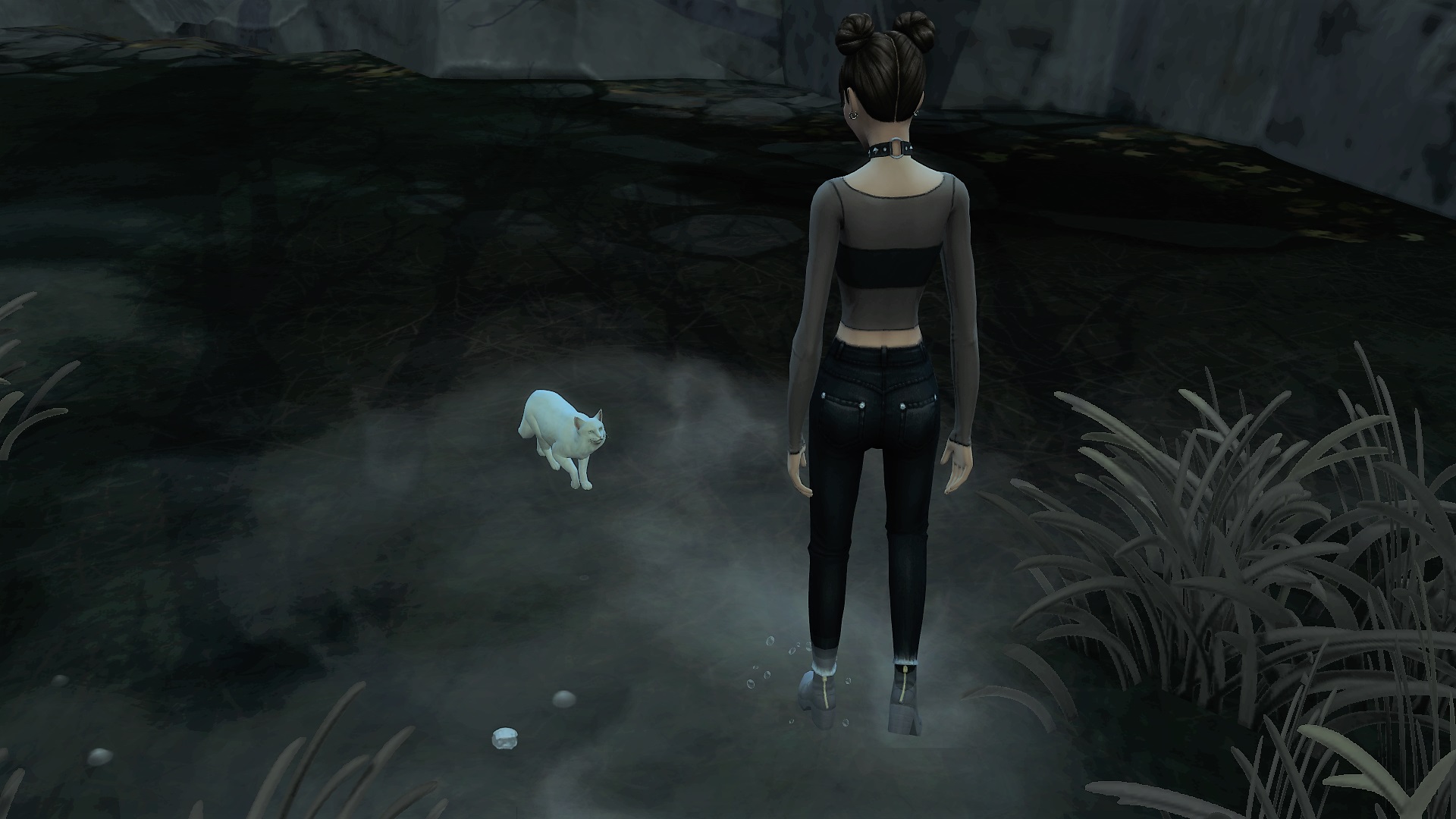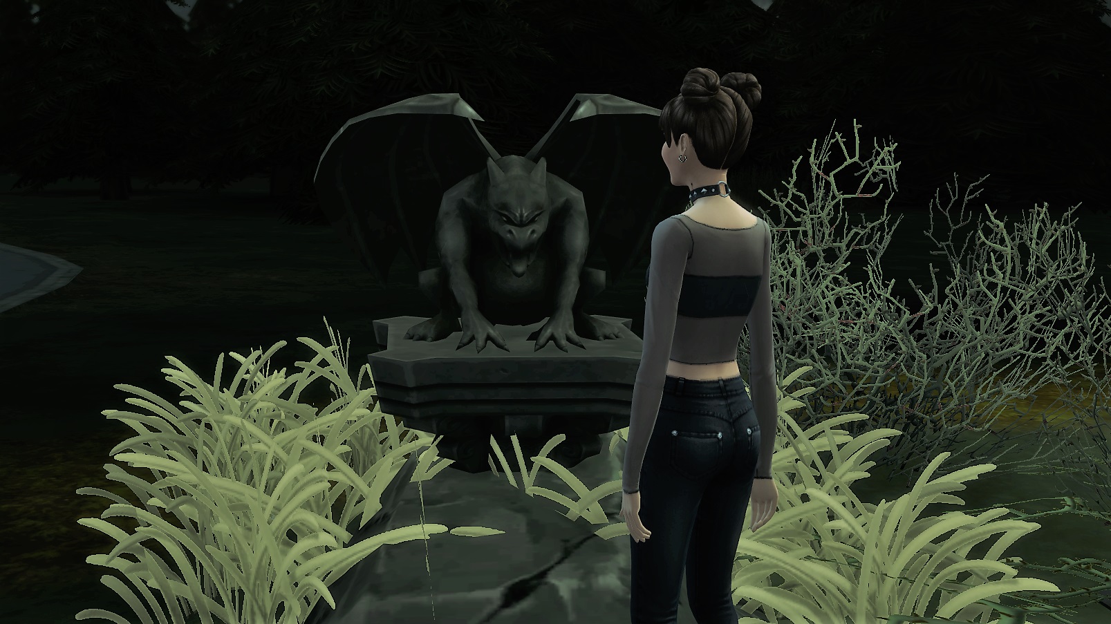 Once again, the cat appeared in front of her. He bounded past her and jumped behind a statue of a winged creature that was protruding from the long grass.