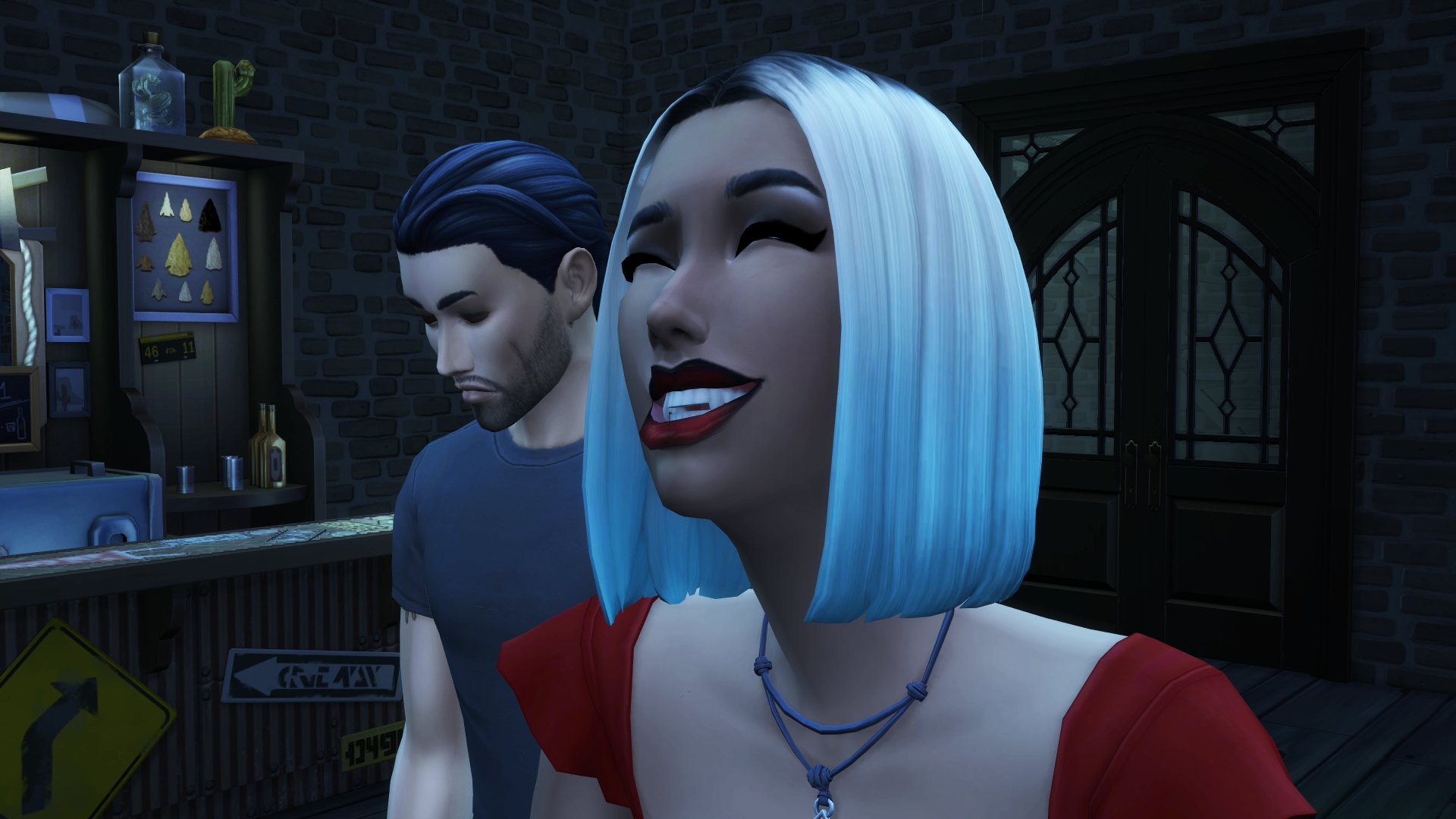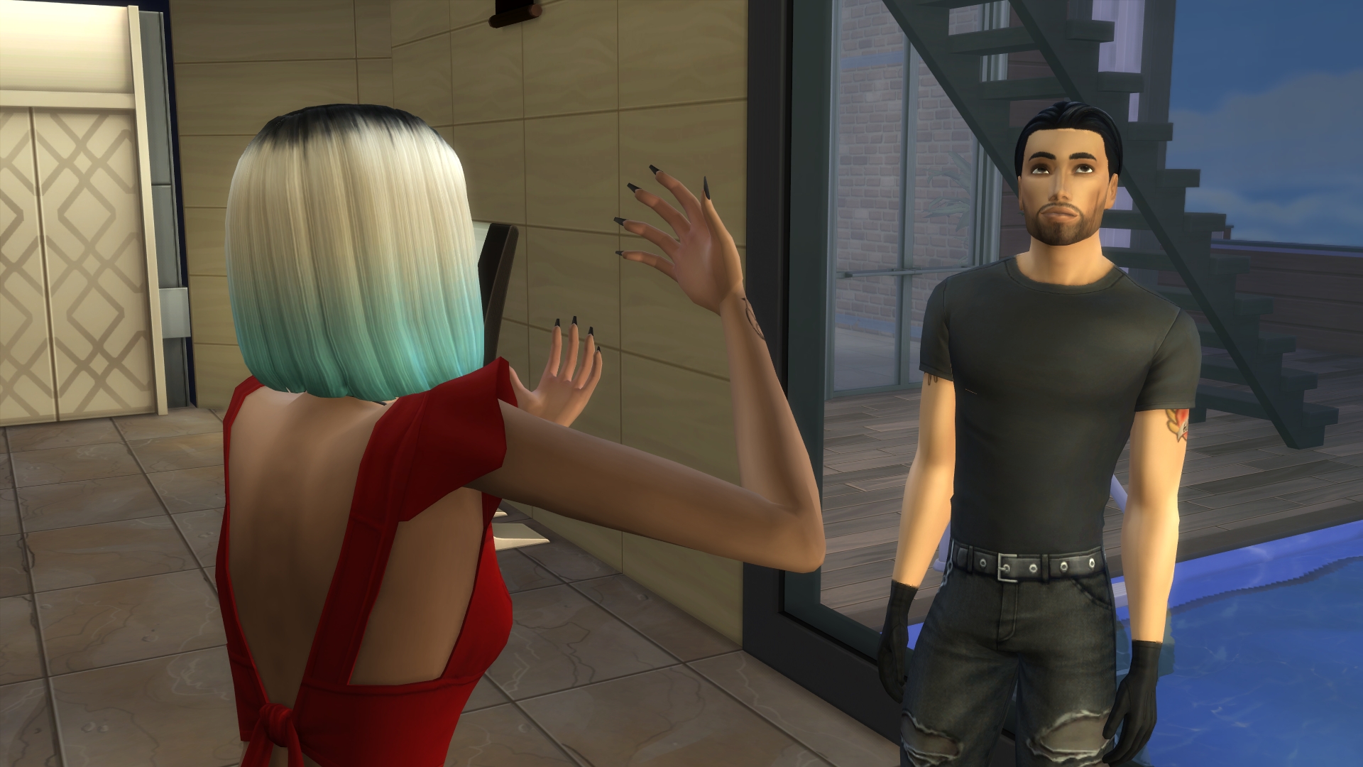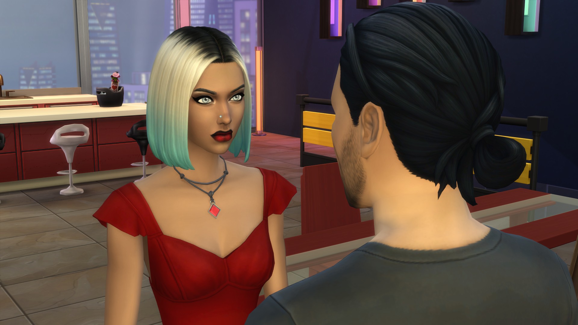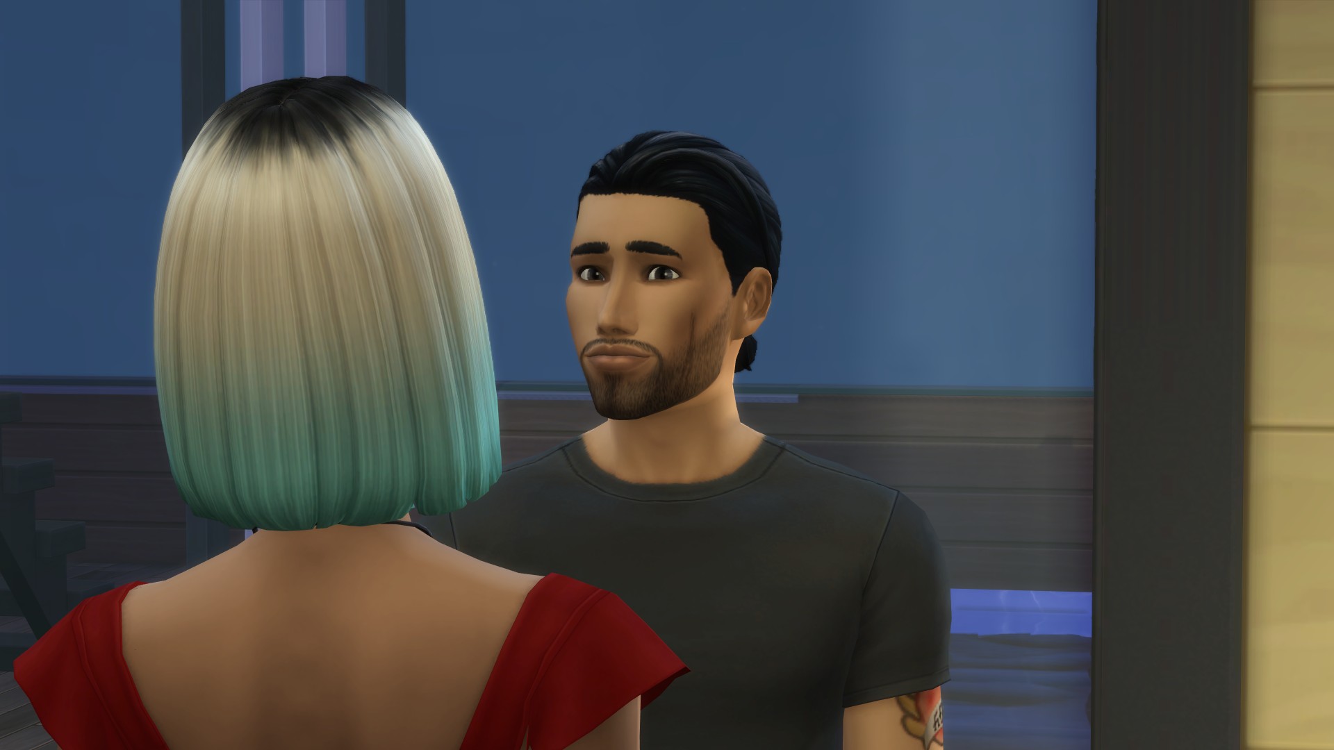 “I look like every ‘bad bloke’ in SimLit,” he snarled, cutting off her question.’ I laughed so much! All he’s missing is that squarish chin and some sort of creepy uncanny valley CC skin. I like Faith’s less innocent look, the red dress and necklace sort of gives me a ‘film noirish’ femme fatale vibe. Wow, those comments- is this his ‘fondness’ slipping through or just more performative BS to keep her wanting him?