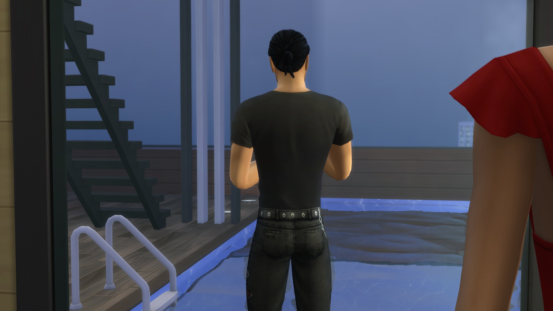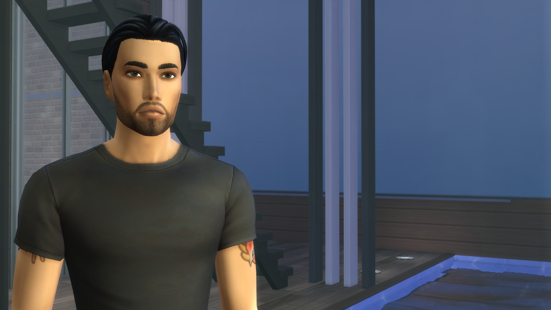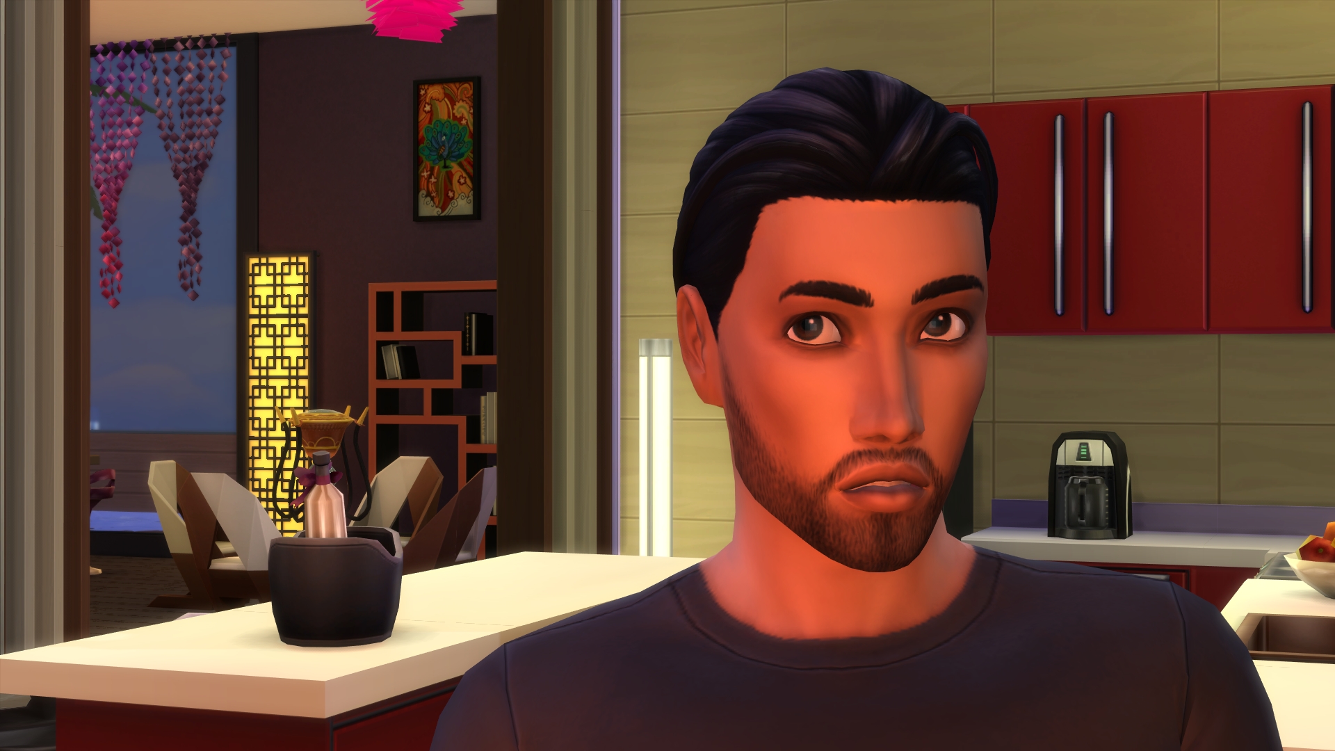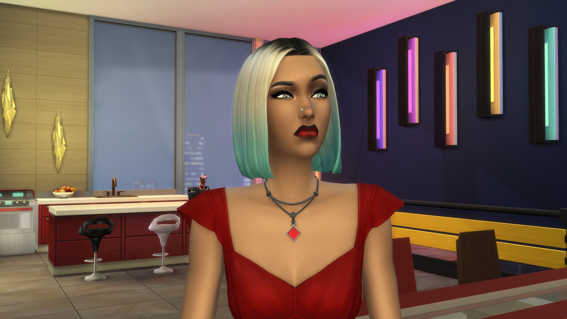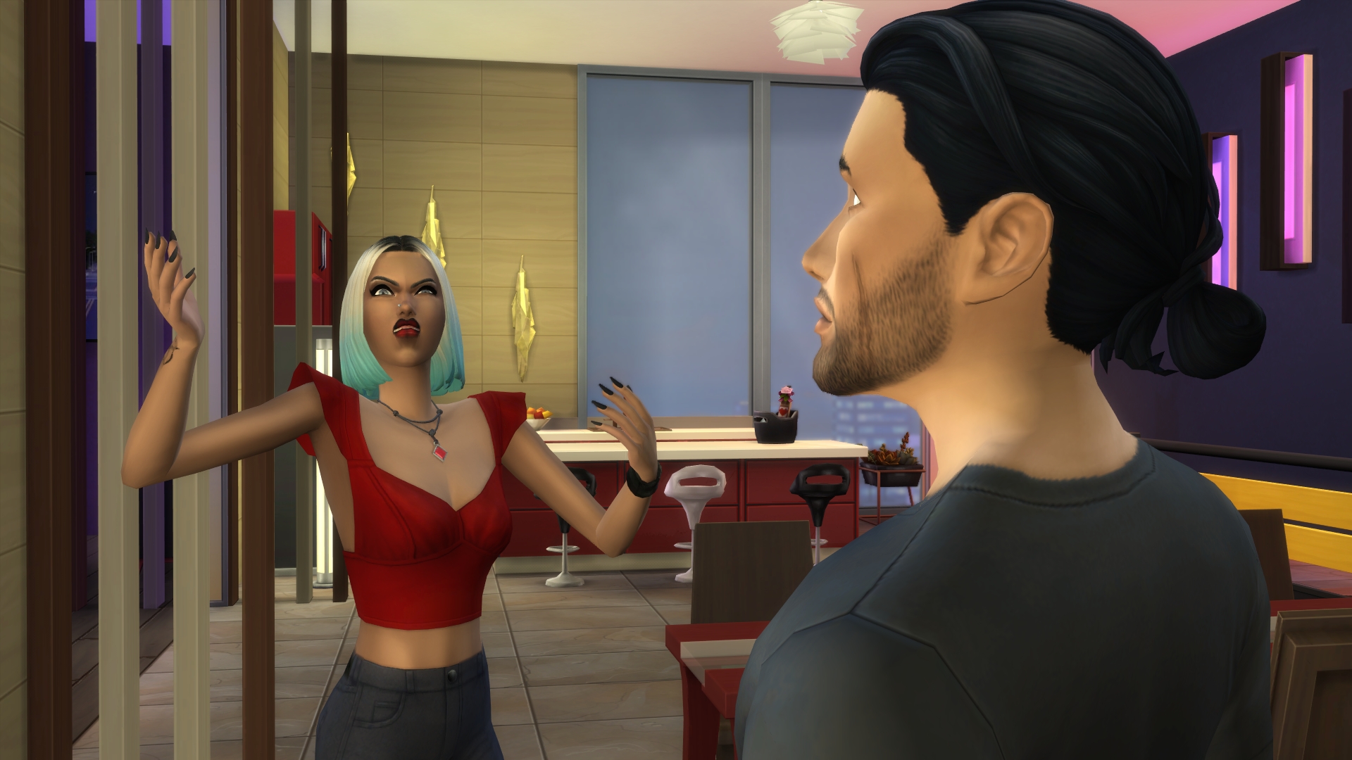 “I look like every ‘bad bloke’ in SimLit,” he snarled, cutting off her question.’ I laughed so much! All he’s missing is that squarish chin and some sort of creepy uncanny valley CC skin. I like Faith’s less innocent look, the red dress and necklace sort of gives me a ‘film noirish’ femme fatale vibe. Wow, those comments- is this his ‘fondness’ slipping through or just more performative BS to keep her wanting him?