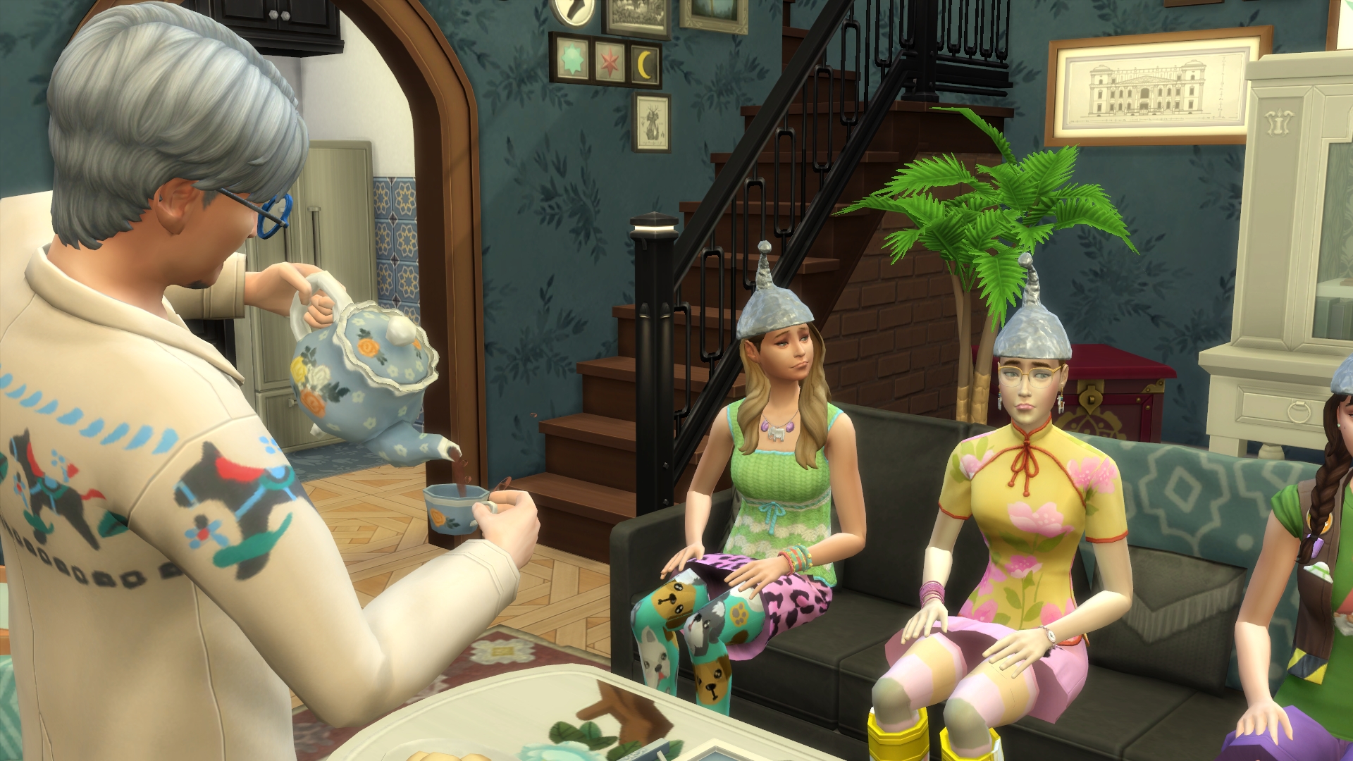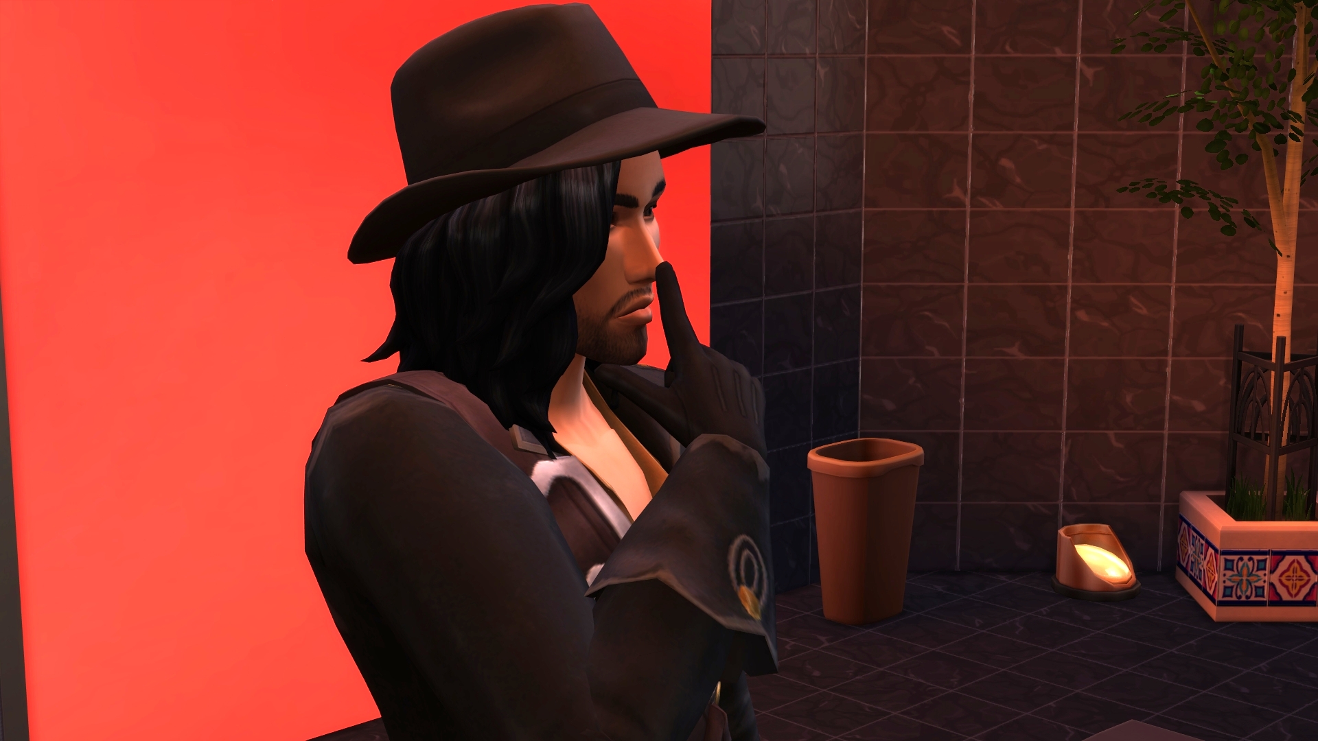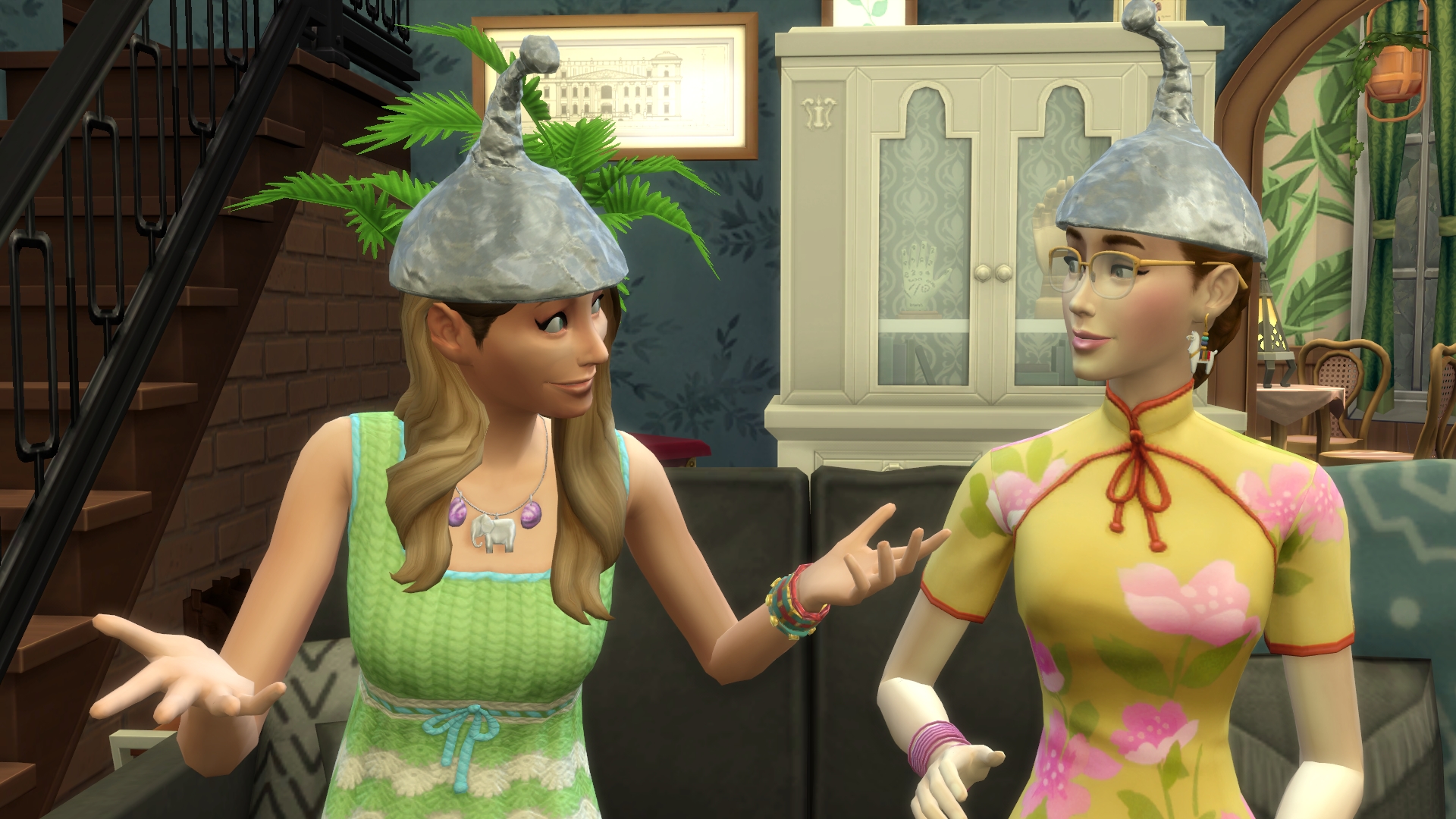 1. Maybe Yibbo is secretly very pleased about all these chances to encounter Grim, but trying to not seem too keen? Mostly I am guided in GliTS scenes by the moods of the sims and Yibbo gets tense whenever there are more than a few sims in a room, hence all her miserable faces. I am endlessly inspired as to what the heck has happened in the scene that makes Yibbo pouty but is simultaneously making Morag SMILEYHAPPYCRAZY. 😆 Paul sort of hinted that he was trapped in the forest forever but more on that later. Woo! Trespass! I think it might be breaking and entering but Jessica is a cop so that’s OK, right? I’ll go with yes.