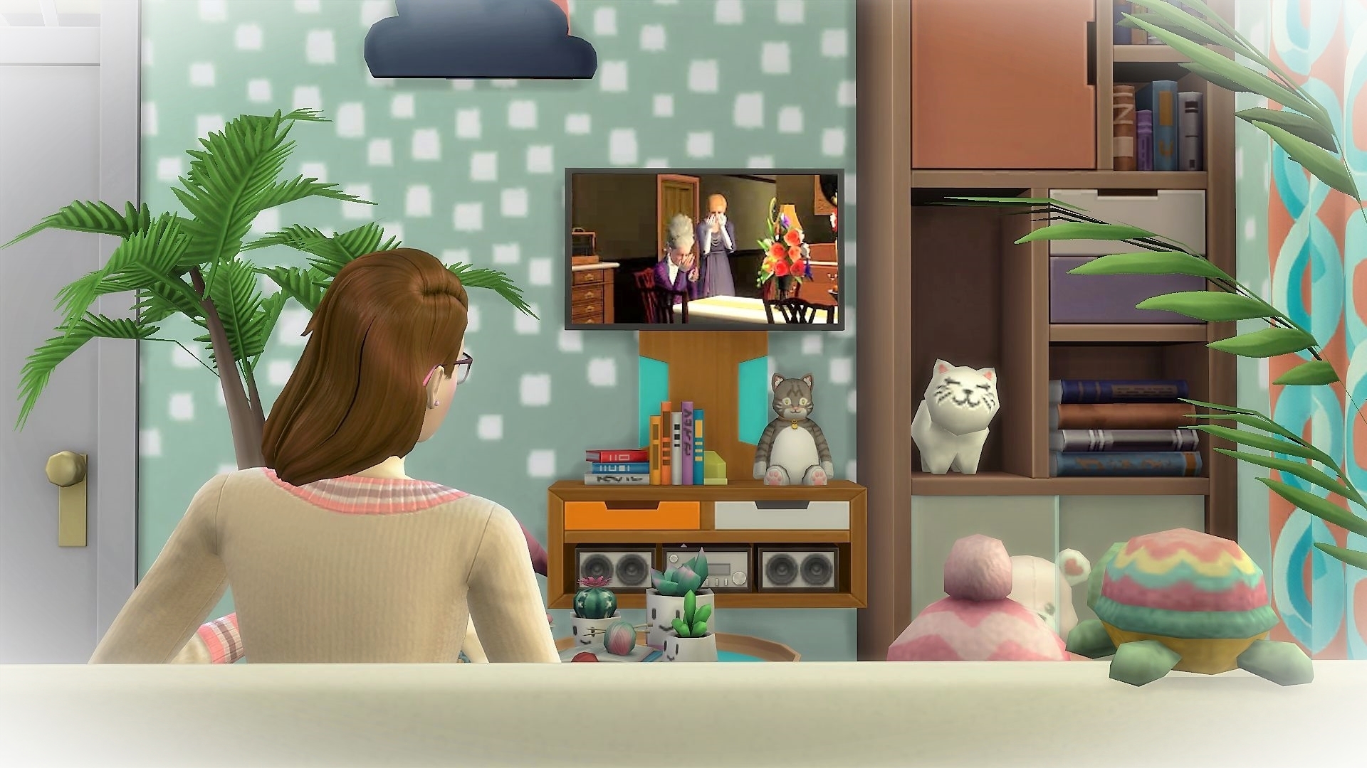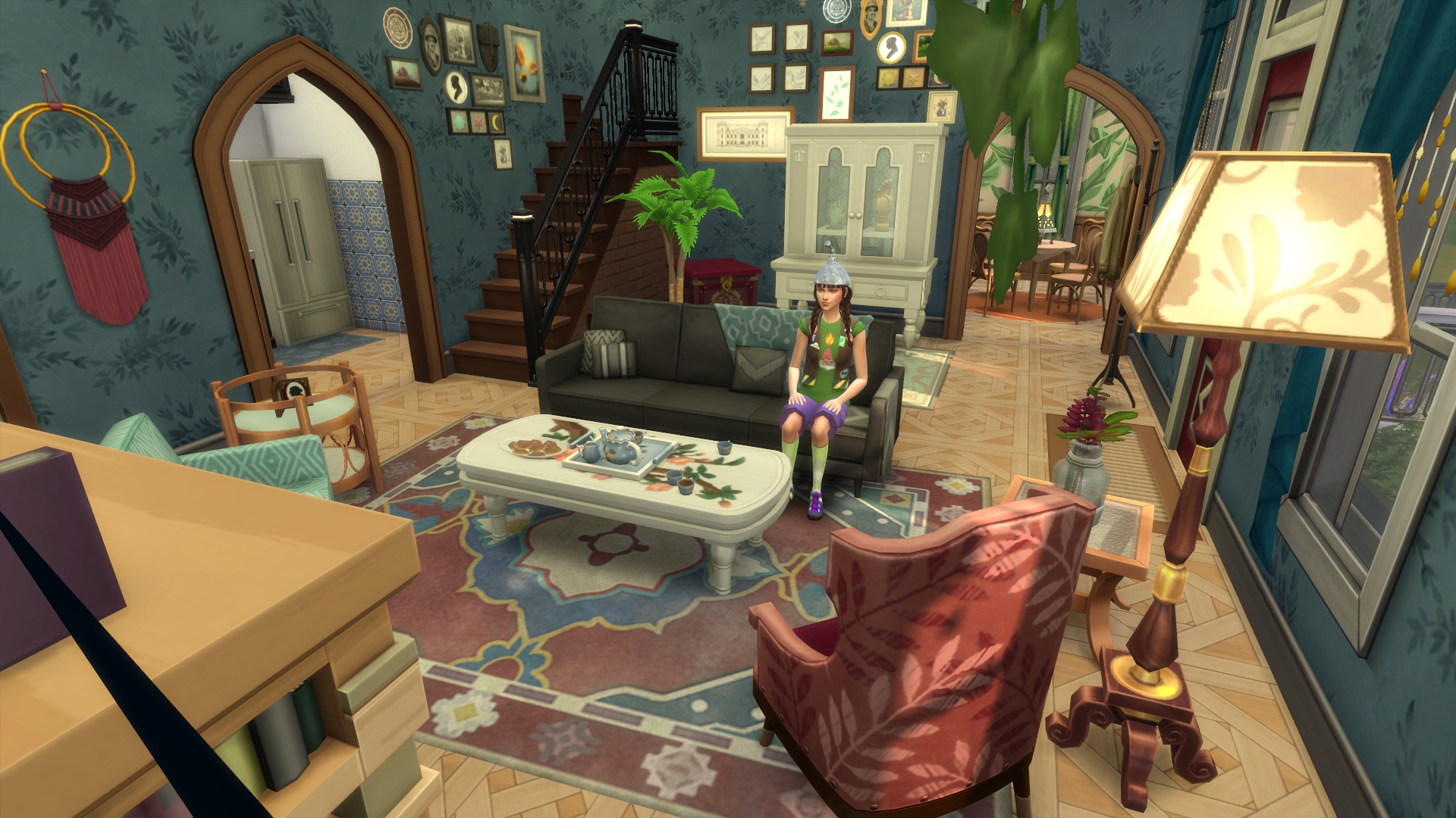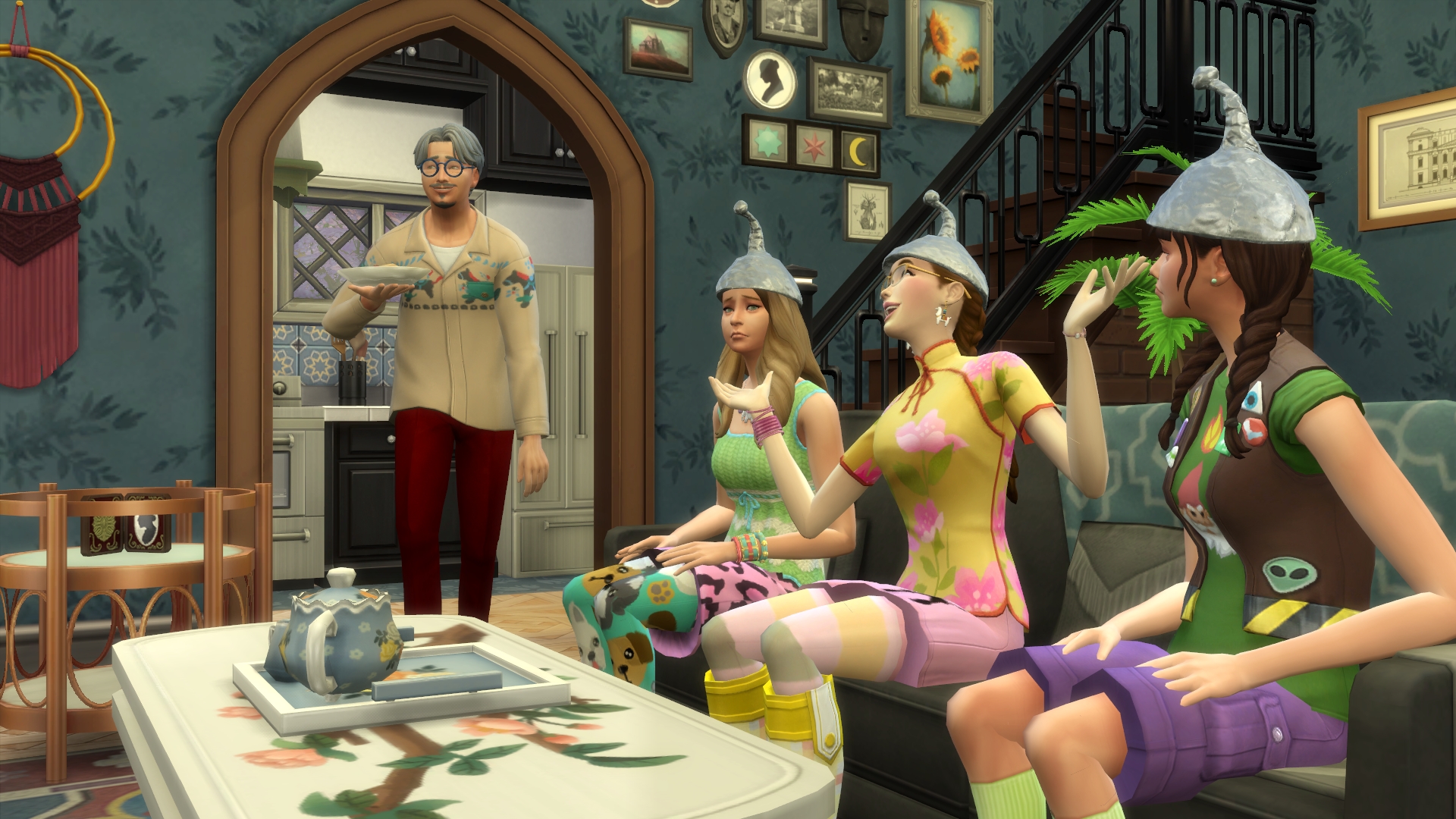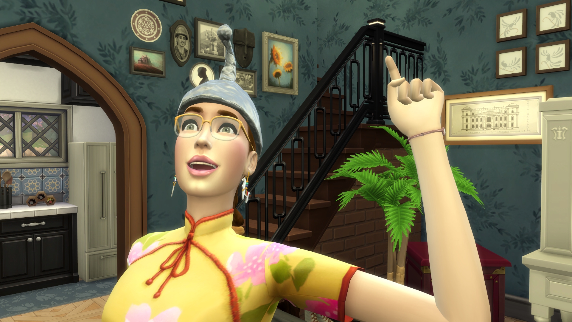 1. Maybe Yibbo is secretly very pleased about all these chances to encounter Grim, but trying to not seem too keen? Mostly I am guided in GliTS scenes by the moods of the sims and Yibbo gets tense whenever there are more than a few sims in a room, hence all her miserable faces. I am endlessly inspired as to what the heck has happened in the scene that makes Yibbo pouty but is simultaneously making Morag SMILEYHAPPYCRAZY. 😆 Paul sort of hinted that he was trapped in the forest forever but more on that later. Woo! Trespass! I think it might be breaking and entering but Jessica is a cop so that’s OK, right? I’ll go with yes.
