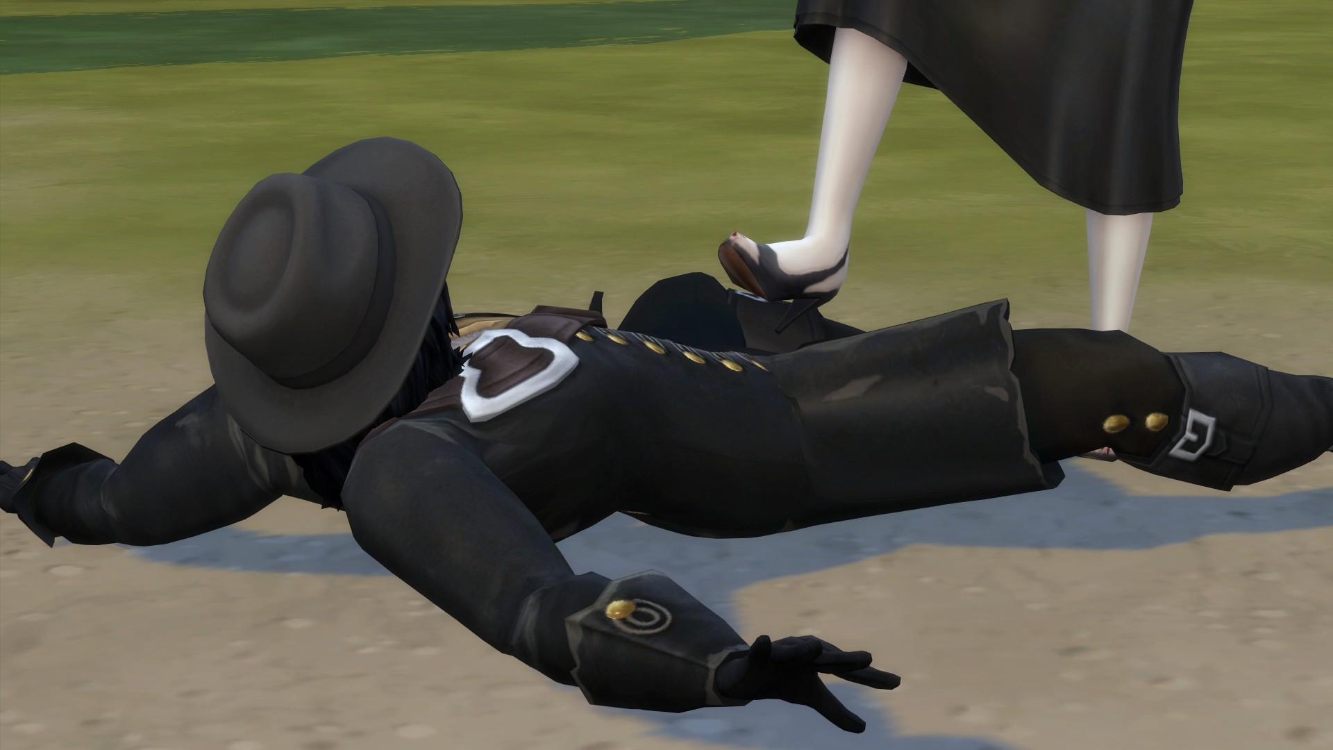 She lifted her foot from the breast of his jacket, hovering it over his torso. “Wherever shall we begin with our reminder?” she mused, turning her heel in a circle in the air. “Aha!” She bent her knee until her dainty stiletto was positioned precariously in the air between his thighs.