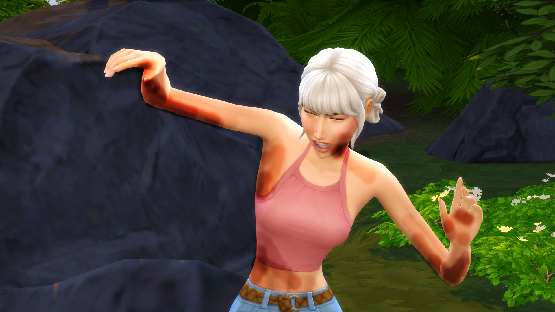 She soon realised that the sun wasn’t listening and was starting to hurt her. Unfortunately, she hadn’t been looking where she was going, so as she’d run from impending solar doom, she had slipped and ended up covered in mud, forcing her to shower.