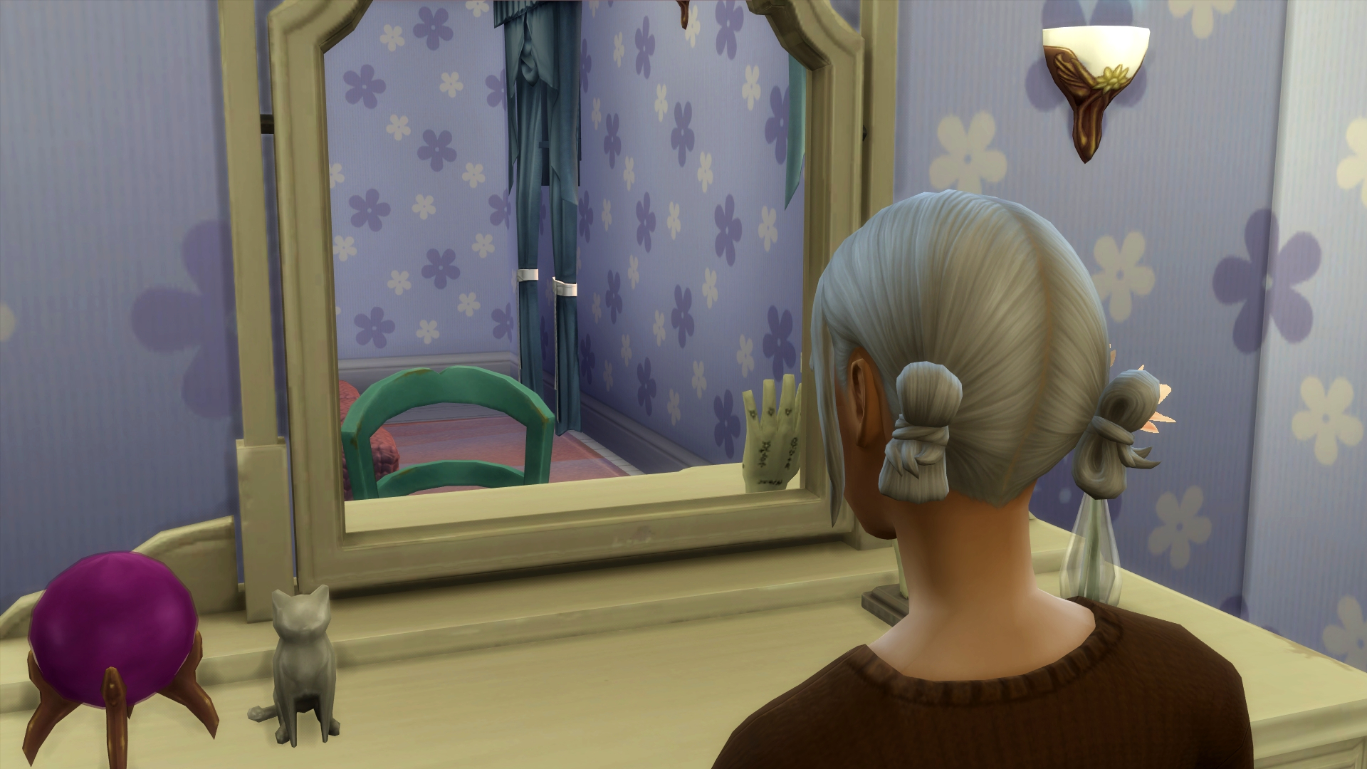 Unfortunately most of the dresses were too big for April, or had lots of complicated fastenings she couldn’t do up herself, so she settled on a simple brown jumper and a long skirt with pretty flowers on it. Satisfied with her outfit, she sat at the dresser to do her daily beauty routine.
