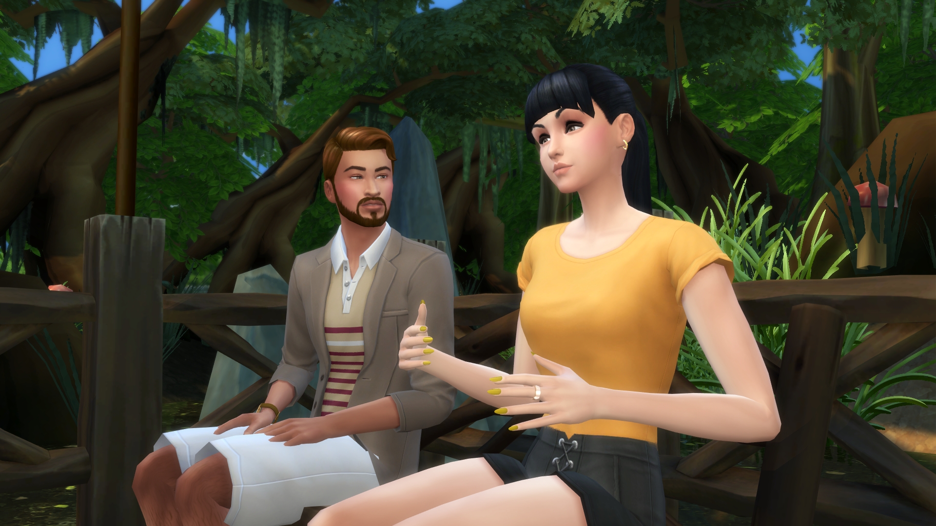 They had reached a small, rickety bench that overlooked the waters and had taken a seat, listening to the buzz of swarms of filthy bugs and watching the sun peeking through the twists of the tree canopy.