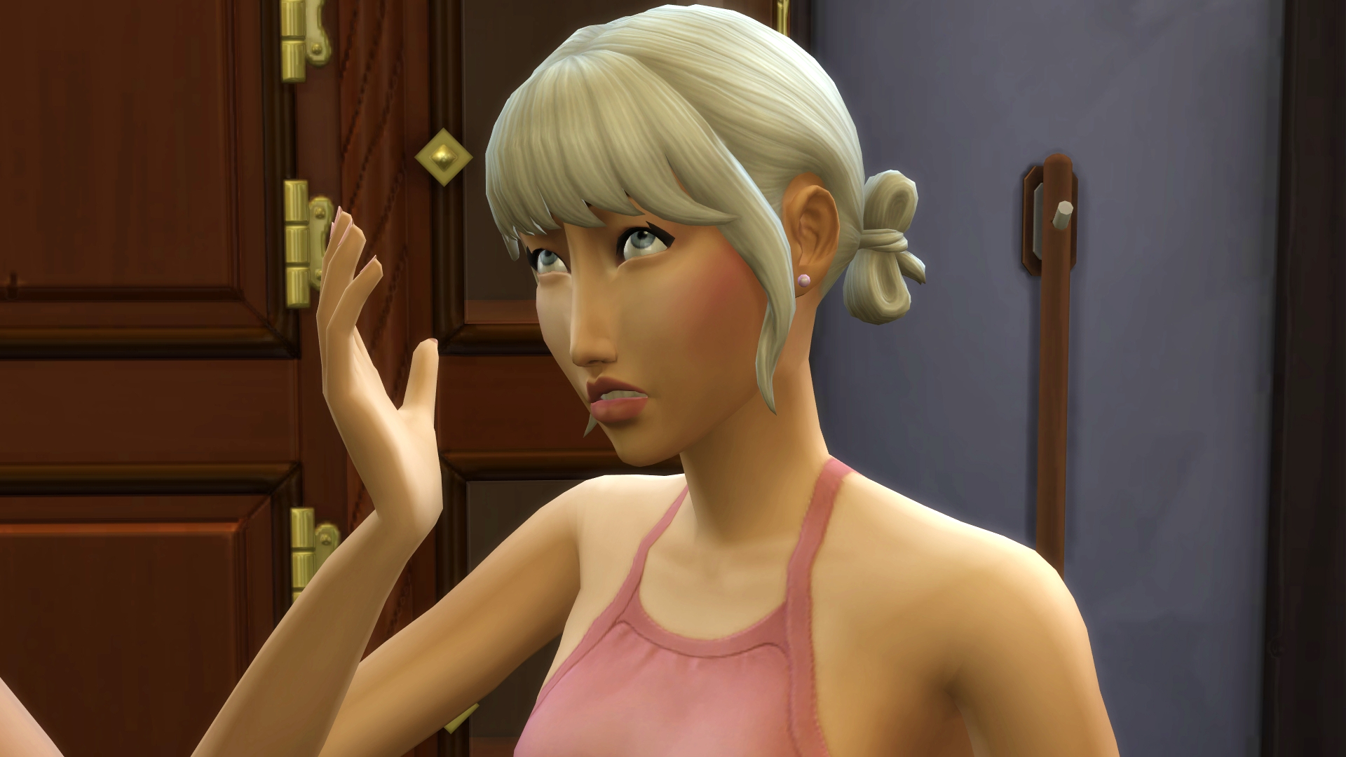 “No, I mean, earlier when you came home?” she scuffed her shoe into the rug. “I didn’t mean to, if I did.”