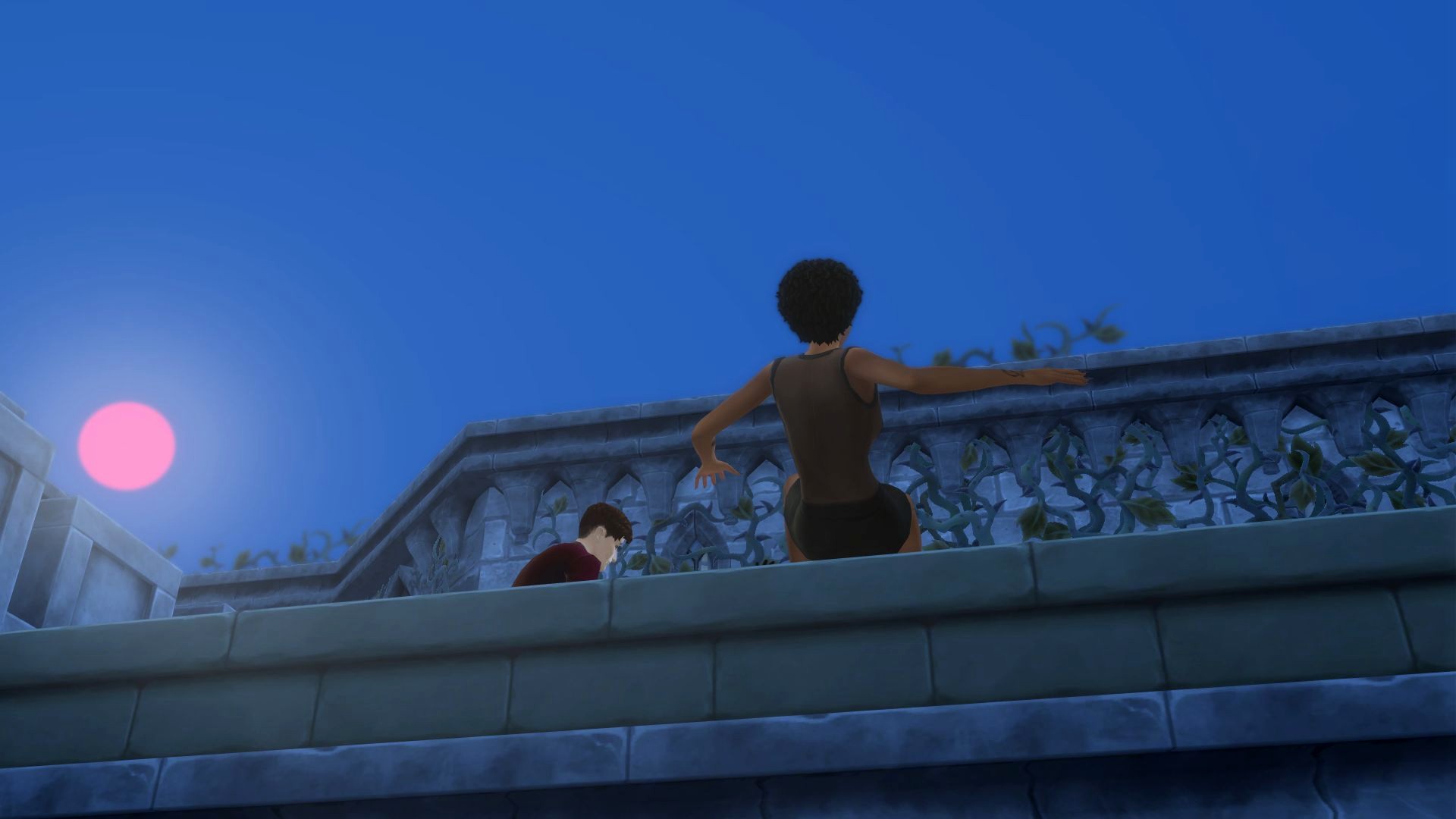 I blink my eyes open and look up at the balcony I think I’ve just fallen from. Through my pretty blurred vision – hey, look, I can’t see for shit but at least I don’t have to wear my fugly glasses – I can just make out two figures.